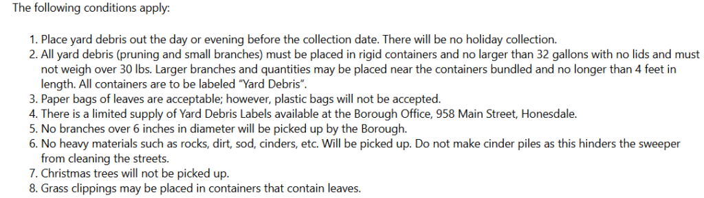 The Honesdale Boroughs Yard Debris collection will begin on Monday, April 13th and continue every other Monday through the last week of October. Collections scheduled on a holiday will be picked up the following Tuesday.