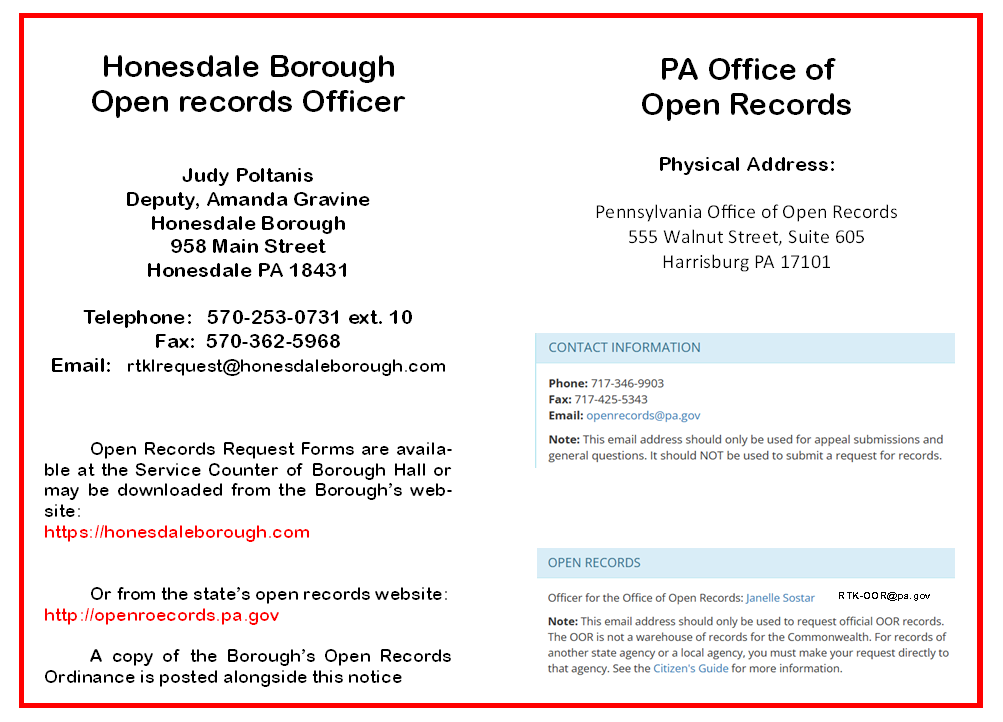 Open Records Request Forms are available at the Service Counter of Borough Hall or may be downloaded from the link below. All requests must be addressed to the Agency Open Records Officer. In addition, Honesdale Borough’s policy and procedures can be access from the link below.
