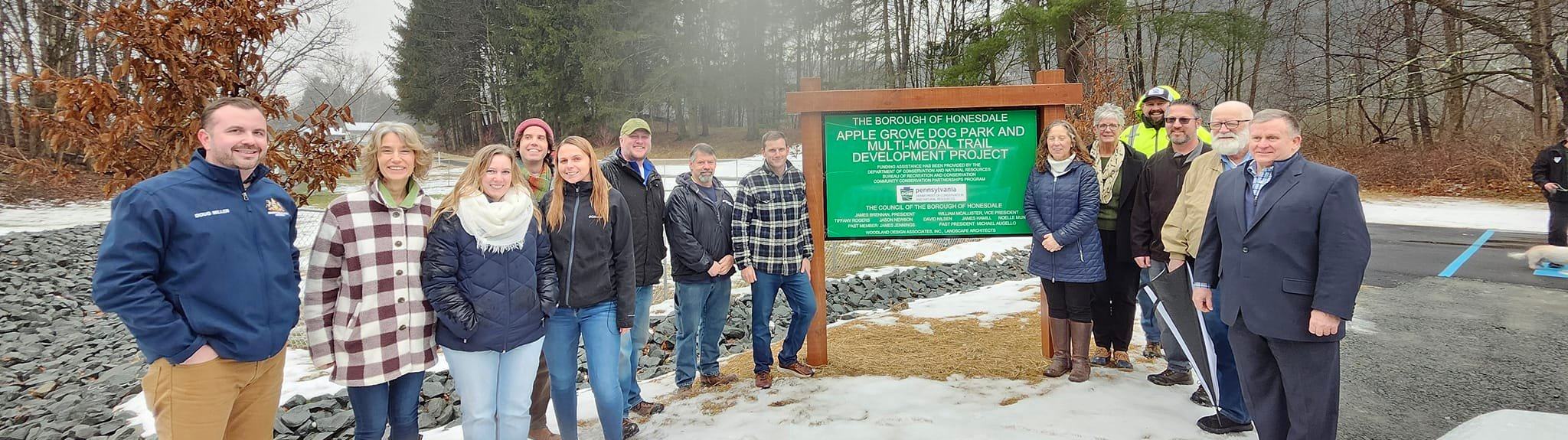 Left to Right, PA Senator Rosemary Brown aide Doug Miller; Rep. Jonathan Fritz aide Lorna Burns; Meghan Carney; Mayor Derek Williams; Caitlin Burkhead; Councilor and PMVB respresentative James Hamill; Willie Reinfurt, Reinfurt Excavating dog park contractor; Jayson Wood, landscape architect with Woodland Design; Christine Dettore, PA DCNR; Carolyn Lorent, Parks & Recreation Committee; DPW Director David Nilsen; Brian Batten; Councilor William McAllister and Kevin Kundratic, interim Borough Manager.